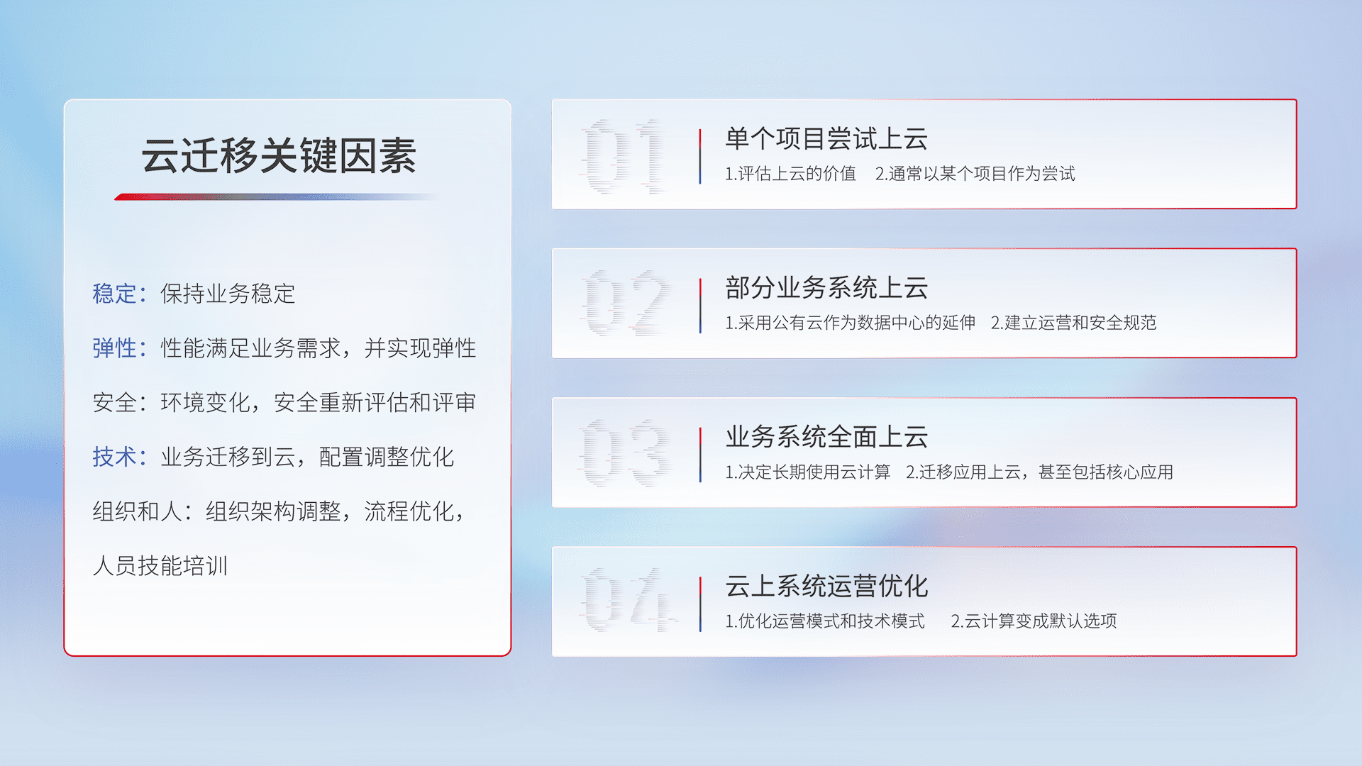 结合实际业务,,从规划设计、、、云平台选型、、、云原生改造、、、、数据迁移、、、、集成交付,,,,迁移全过程为客户识别最佳上云路径,,做好风险识别管理,,,,设计网络架构、、、身份权限、、、、安全审计合规、、操作审计、、日志审计、、、、监控告警策略、、、多站点容灾设计等,,,,对云上基础设施进行整体规划,,,,提升IT治理水平,,,以满足弹性、、、、高可用、、、、高性能的需求。。。。