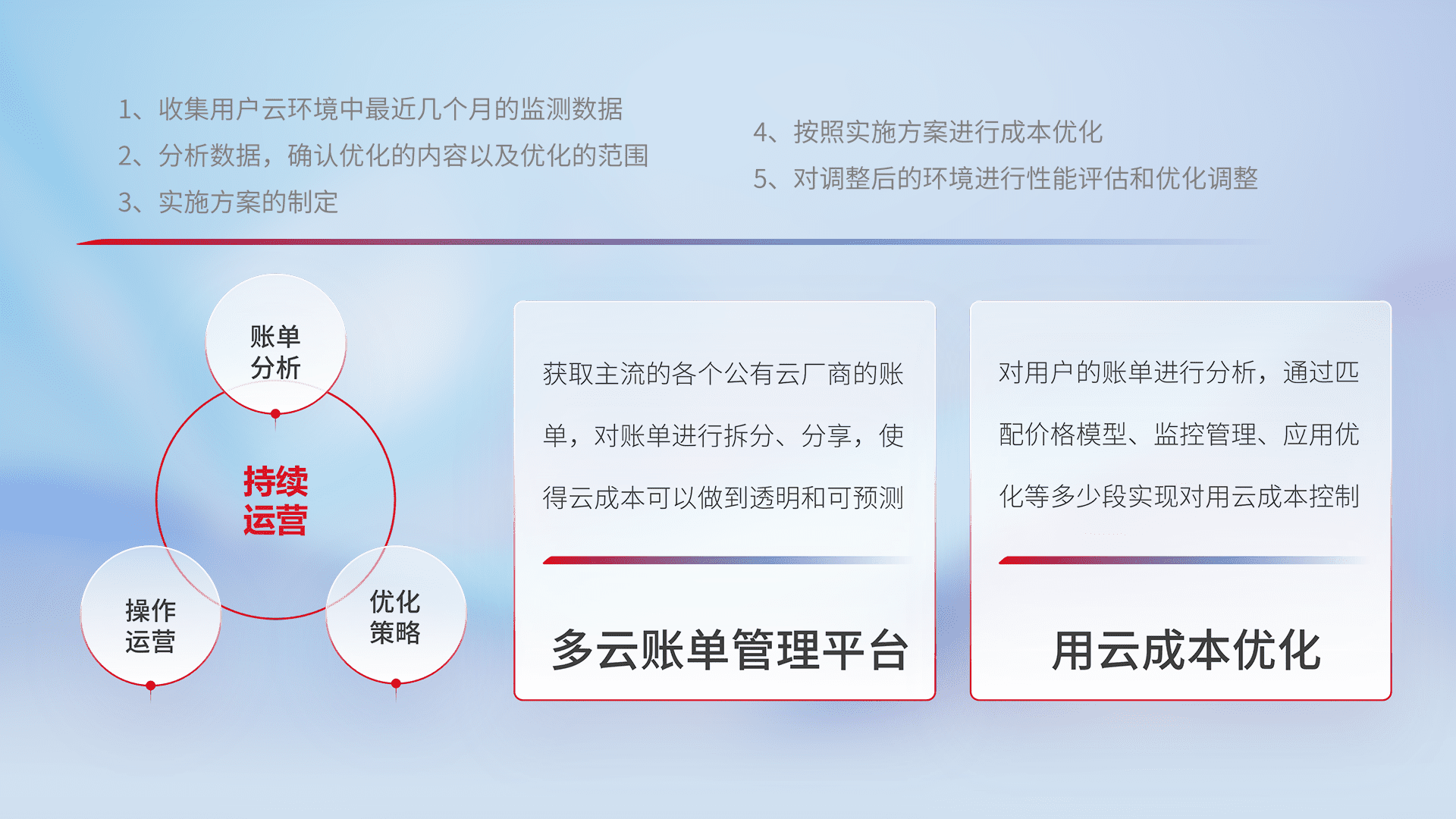 通过多云纳管,,以统一的资源数据模型把客户的云资源进行抽象和封装,,,,进而实现对多云资源的统一操作,,,,保障云资源管理的可靠性、、、、稳定性与可用性。。。量身定制化运维内容,,配置、、、开发运维、、、补丁管理、、备份、、、监控、、认证和访问管理、、审计和日常巡检等,,,,保障在用云过程中的可靠度,,,稳定度以及高可用率。。。